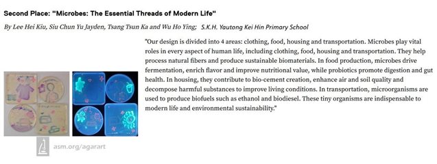 今年度有8位五年級學生代表學校遠赴美國參加「國際瓊脂藝術大賽」,勇奪第二名及第五名的佳績。「國際瓊脂藝術大賽」結合科學與藝術,參賽者以瓊脂培養皿作為「畫布」,利用着色的大腸桿菌畫出圖案,創作出兼具科學探究與視覺效果的微生物藝術作品,培育具資優潛質學生的高階思維及跨學科能力,有助發展科學探究、藝術表達與創新解難等多方面的資優智能。